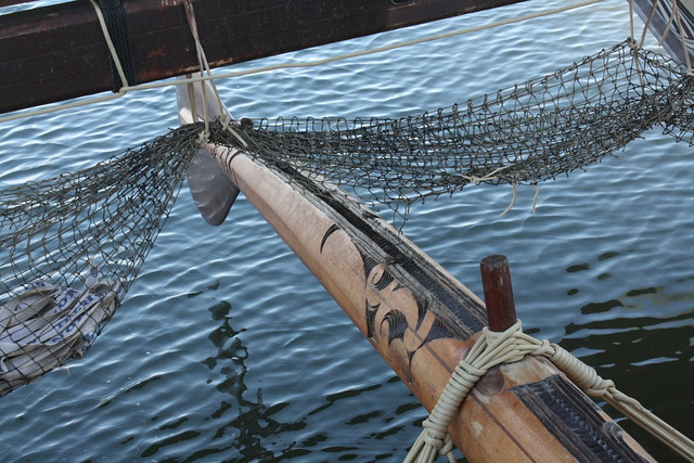 The vakas left New Zealand back in April 2011 and reached US shores by July. We caught up with them in late August when they were looking forward to their winter break in San Diego (due to last from the beginning of September to mid January 2012). Their eventual goal for part II of this epic voyage is to reach the Solomon Islands in time for the Festival of Pacific Arts by late June/July 2012 but they first plan to sail via Cabo San Lucas, The Cocos Islands, the Galapagos and then onto several destinations in the South Pacific including Fakarava, Tahiti, Bora Bora and Raiatea. All the crew are keeping blogs of the experience here – as one blog post read – ‘ the voyage on the ocean is also a journey within, dealing with the fluctuations of our minds as much as with the outer waves and winds‘. The crews that we met seemed a lot happier and ‘together’ than some of those who have sought to revive ancient sailing methods in recent years. The crew on the 1976 voyage of the Hōkūleʻa, which famously featured in a documentary film ‘Voyage of the Hōkūleʻa’, released the same year, were barely speaking to each other by the end due to underlying tensions and crew/navigator conflict. Not so here it seems. The cabins on these vakas were almost as small as those on the Hōkūleʻa but were well equipped and had a cosy rather than claustrophobic feel to them. The beautiful traditional carvings of the vessels were counter-parted by electric solar panels on the back which produce the energy for on-board electronics including, most import